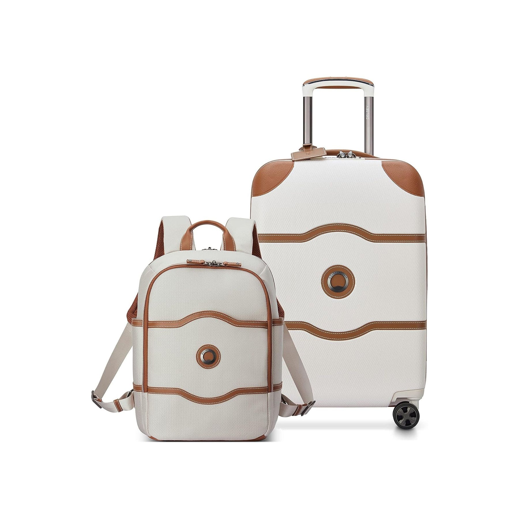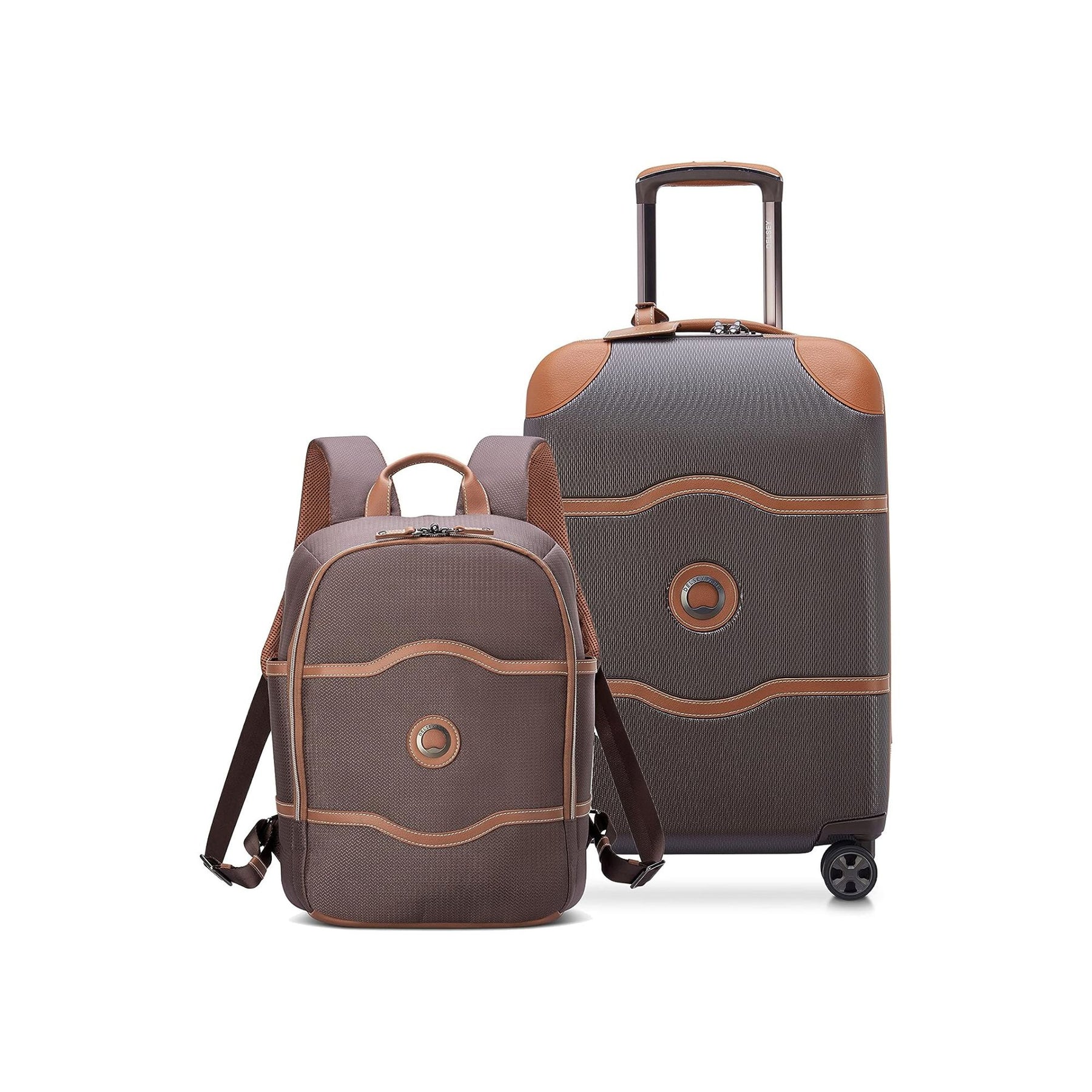 The CHATELET AIR 2.0 2-Piece Set includes a large carry-on and a versatile laptop backpack, both designed for convenience and style. The carry-on features smooth double spinner wheels, a highly secure zipper, antimicrobial lining, and organized compartments for easy packing. The backpack offers multiple pockets, padded laptop and tablet sleeves, and a smart band to attach to luggage handles. Both pieces use durable, eco-friendly materials with vegan leather accents, ensuring comfort and protection during your travels.